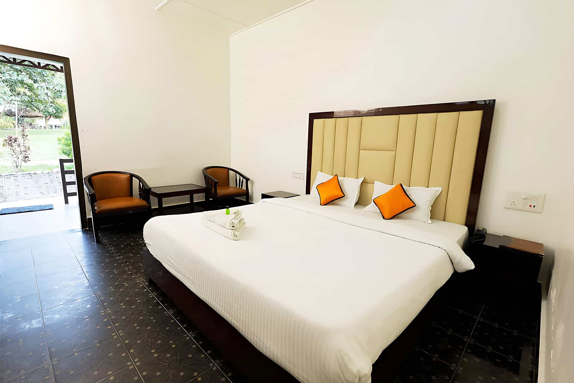 The Deluxe Rooms offer calming views of the resort’s landscaped gardens, lush lawns, and distant trees. The natural environment not only adds to the visual appeal but also creates a tranquil soundscape — perfect for relaxation. Some rooms come with sit-out areas or balconies where you can enjoy the fresh air and gentle Kaziranga breeze.